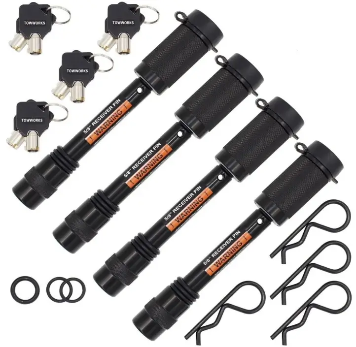 The TowWorks 79634 Keyed Alike 5/8″ Trailer Hitch Lock Set includes four extra-long 3-1/4″ locking pins designed for Class III and IV hitches with 2″ and 2.5″ receivers. All four locks use the same key, making it easy to secure multiple trailers, equipment, or hitch points without juggling multiple keys. With their double-safety mechanism and heavy-duty construction, this 4-pack gives buyers strong, reliable protection for larger towing setups or fleet use