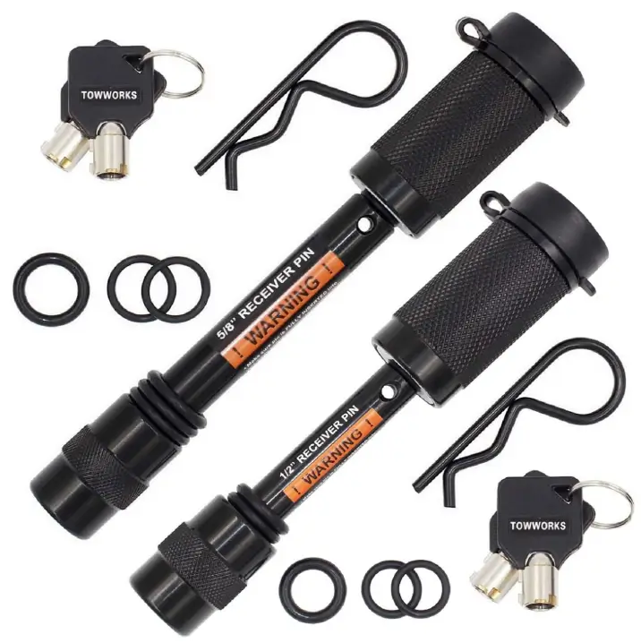 The TowWorks 79852 Keyed Alike 5/8″ Trailer Hitch Lock Set provides two heavy-duty locking pins that use the same key, making securing adjustable channel mounts simple and hassle-free. Each pin features a double-safety design that keeps your setup firmly locked, offering strong protection for Class III–V hitches under heavy towing conditions. Built for strength, durability, and smooth operation, this set gives buyers reliable, convenient security for multi-pin hitch systems