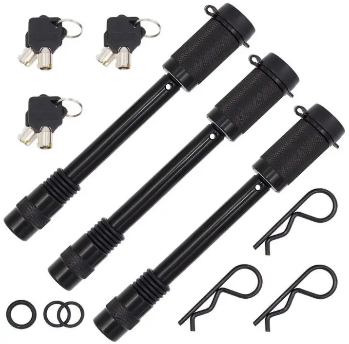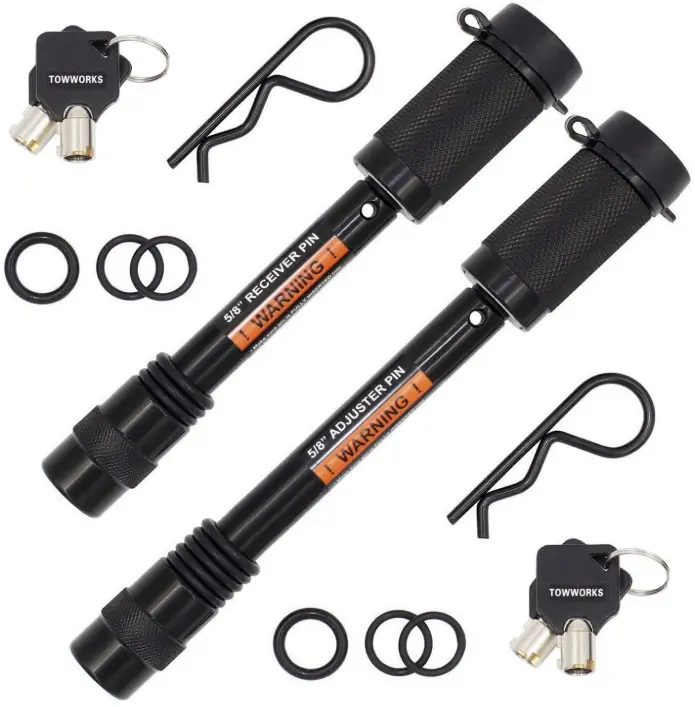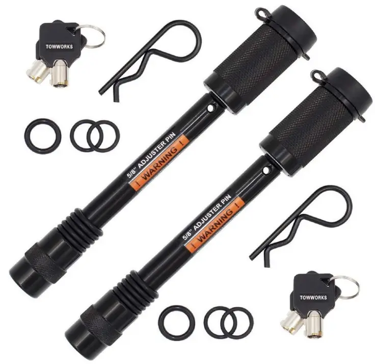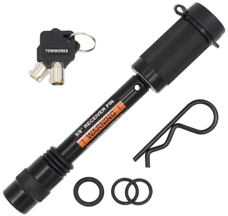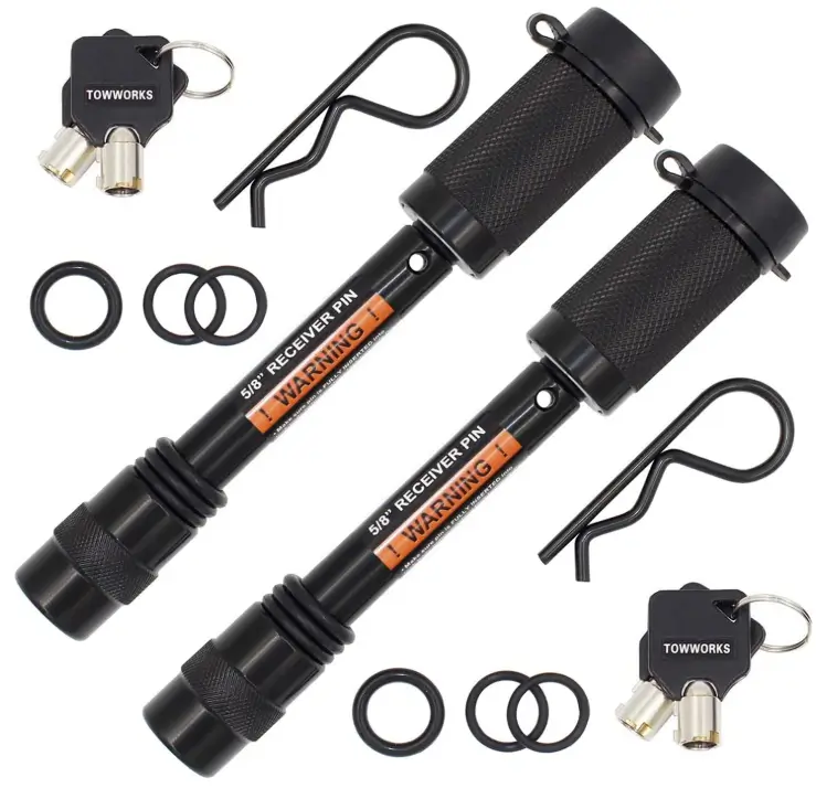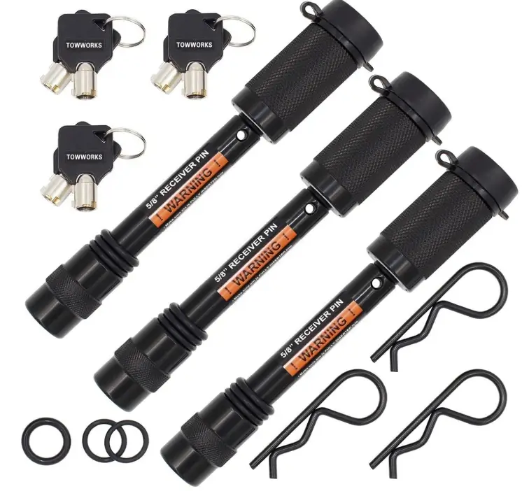 The TowWorks 79633 Keyed Alike 5/8″ Trailer Hitch Lock Set includes three extra-long 3-1/4″ locking pins designed to fit Class III and IV hitches with 2″ and 2.5″ receivers. All three locks operate with the same key, making it easy to secure multiple hitch points or multiple trailers without managing a bunch of keys. With their double-safety design and heavy-duty construction, this 3-pack gives buyers strong, reliable protection and long-lasting performance for any towing setup